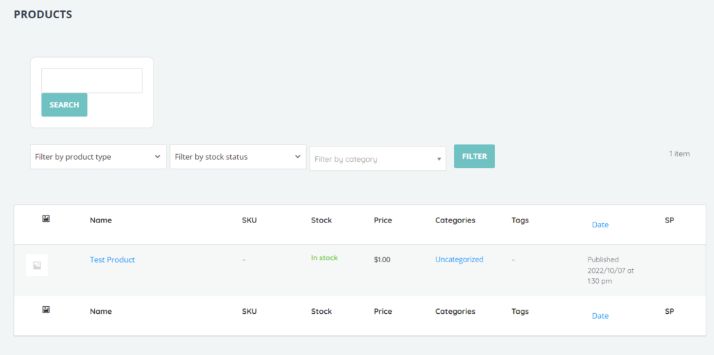 The products page includes a search bar where the user can search for a specific product in the table, a filtering section where the user can filter products by type, status, or category, and an All Products Table.